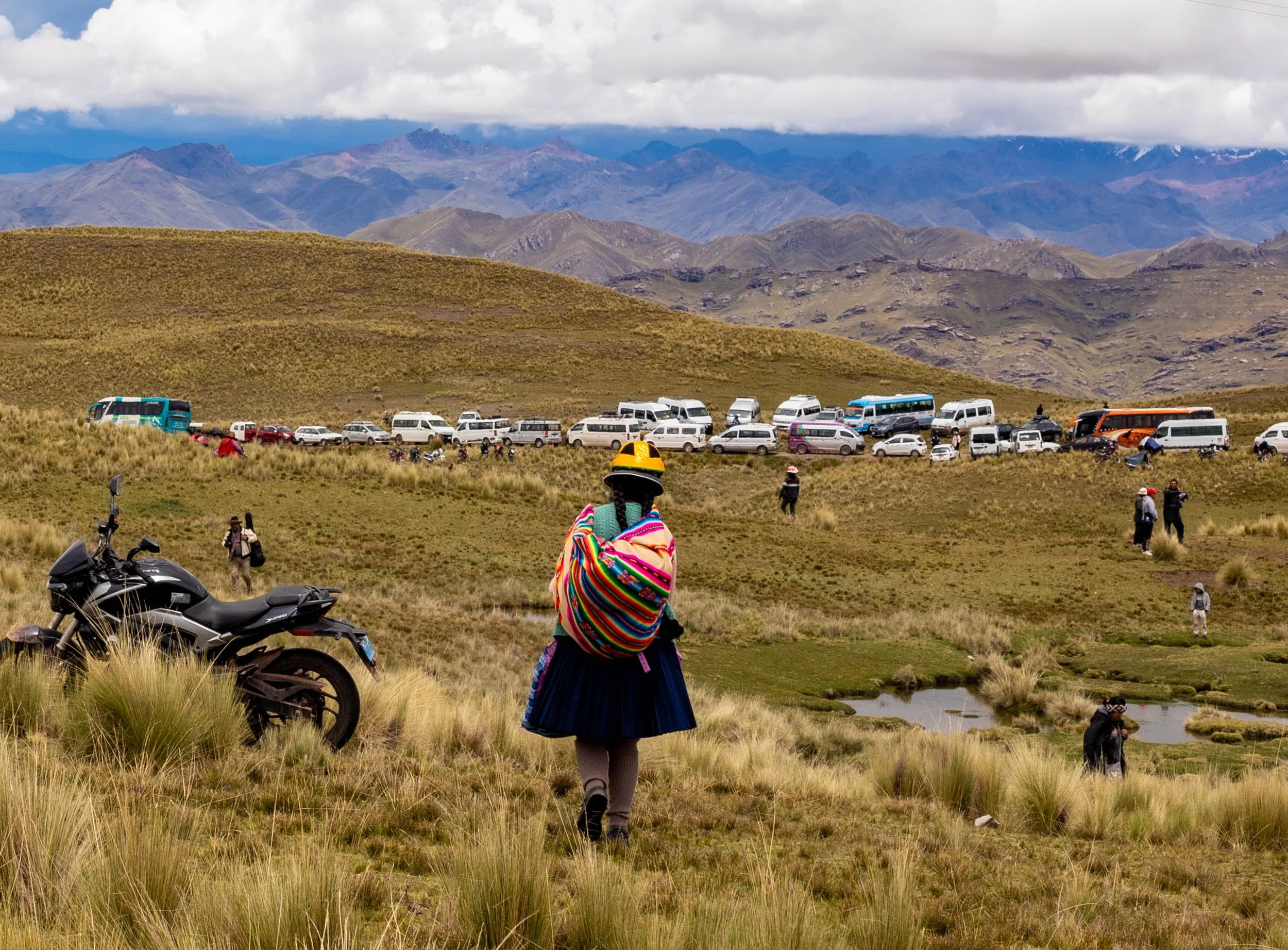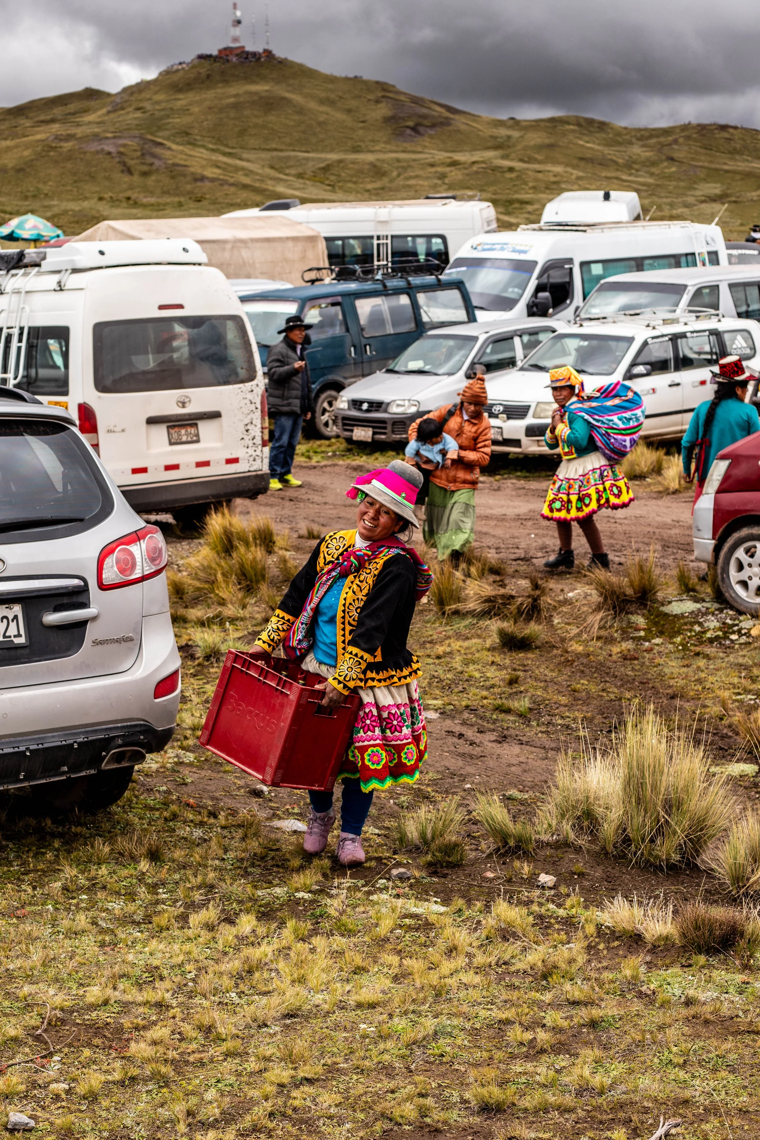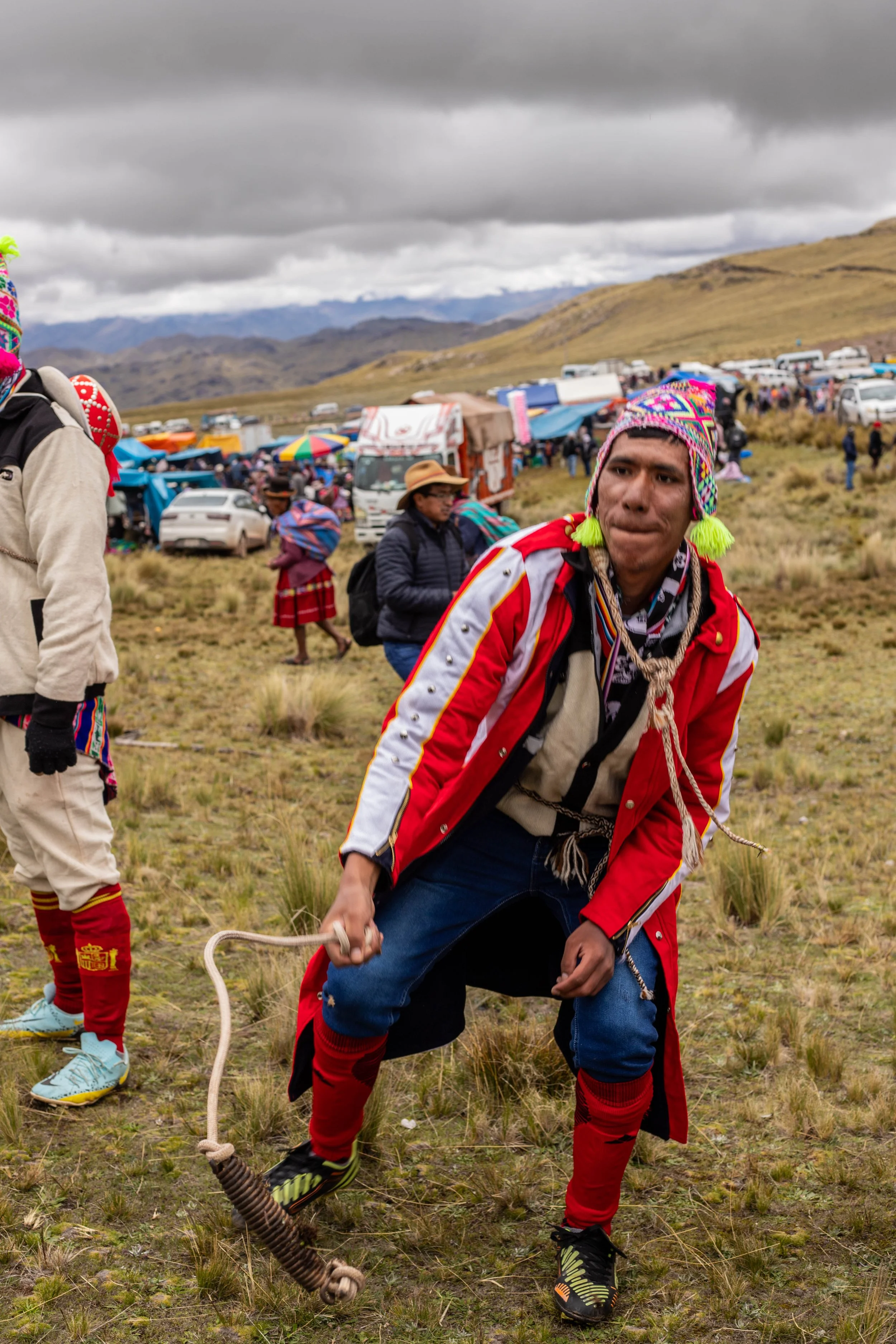 Picture two mountains, radio antennas on each side, between the two: sprinkles of color: red, pink, yellow, brown, blue, and black. A kilometer away from the action, these dots of colour are the men participating in the battle. They traditionally use a huaraca, a knitted sling used to launch stones (at their opponent's head). But this doesn’t look like a medieval battle movie or a western film. There is no "front line”. Men charge and retreat across the pampa (battlefield) in groups, like teams waiting for their turn to play.